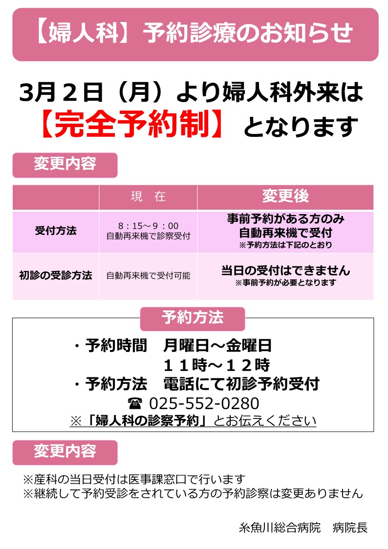 令和8年3月2日(月)より婦人科外来は【完全予約制】となります。